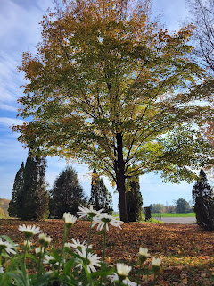 The rain paused and my lawn guy showed up, so he's mulching up wet leaves. I don't suppose it matters if the leaves are wet or dry, but I was surprised to see him out there. Rain or shine I guess.